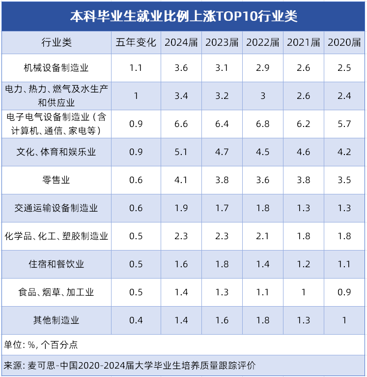 这10个行业类的分布特征明显:制制业相关行业占领从导,涵盖机械设备、电子电气设备等多个细分范畴,占TOP10中的6席。这一态势表现了我国制制业转型升级成效,高端配备制制、电子消息等焦点范畴对专业本科人才需求兴旺。同时,能源保障、消费升级、平易近生办事等类行业的稳步增加,也为大师将来职业选择供给了更多元标的目的,这些增加显著行业对应的专业范畴,值得沉点关心。